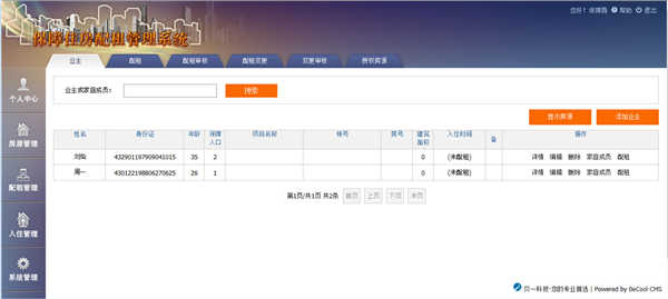 配租管理中包含業(yè)主及家庭成員增刪改查、配租、配租審核、配租變更、變更審核及授權(quán)房源等功能。