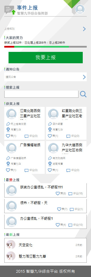 事件上報(bào)前臺(tái)主要功能有:提交上報(bào)、搜索上報(bào)、查看獲獎(jiǎng)上報(bào)、查看最贊上報(bào)、查看最新上報(bào)等操作。提交上報(bào)操作前須關(guān)注“九華人”微信公眾號(hào),并進(jìn)行帳號(hào)注冊(cè)后才可進(jìn)行操作。