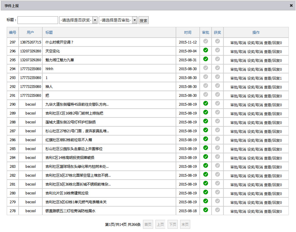事件上報(bào)后臺(tái)主要功能有:收集所有上報(bào)數(shù)據(jù),并進(jìn)行查看上報(bào)、回復(fù)上報(bào)、上報(bào)審核、上報(bào)設(shè)獎(jiǎng)等操作。