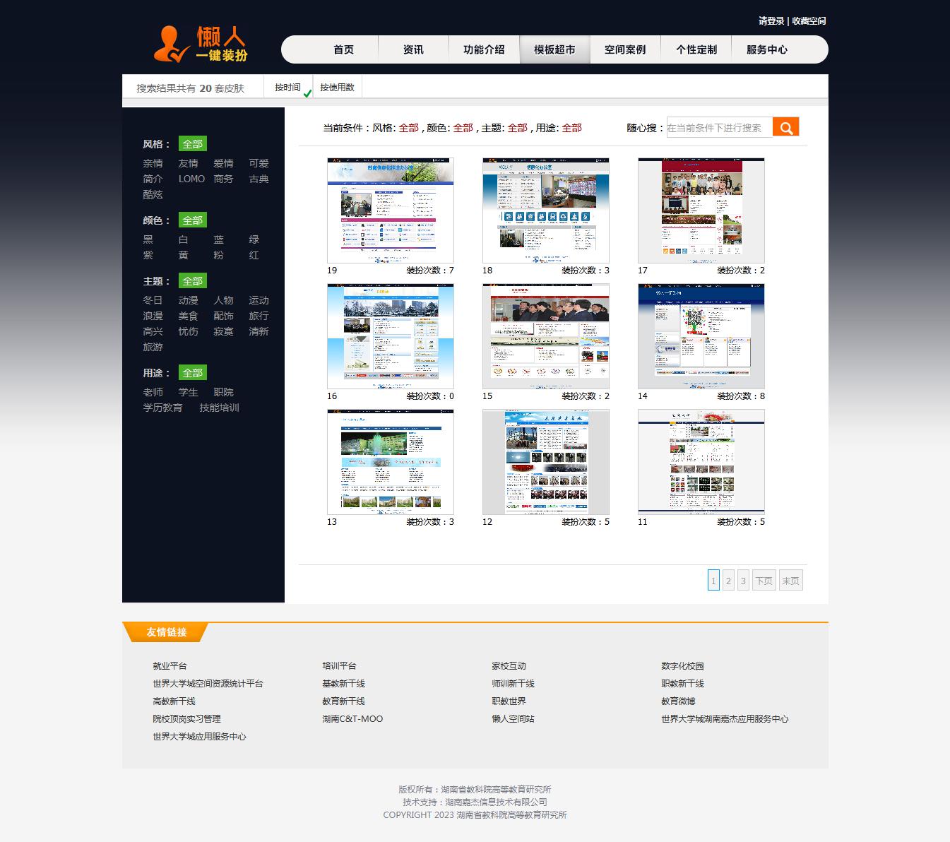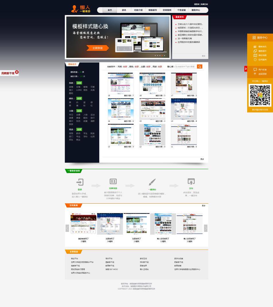 懶人一鍵裝扮系統(tǒng)是為世界大學城空間量身打造的一款一鍵式建設及美化工具。該工具為不僅為空間不同角色用戶,如:學生、老師、領導、職能處室提供了多樣性空間模板選擇,而且可以直接同步空間應用功能,使欄目建設、文章發(fā)布、導航建設等功能都可以在該工具上一站完成。該工具為用戶提供了一個無需了解HTML、CSS、PS等代碼,無需學習計算機使用軟件,就可以快速打造一個美觀實用的的空間,解決了用戶自主建站耗時長、專業(yè)要求高、操作復雜等問題。
