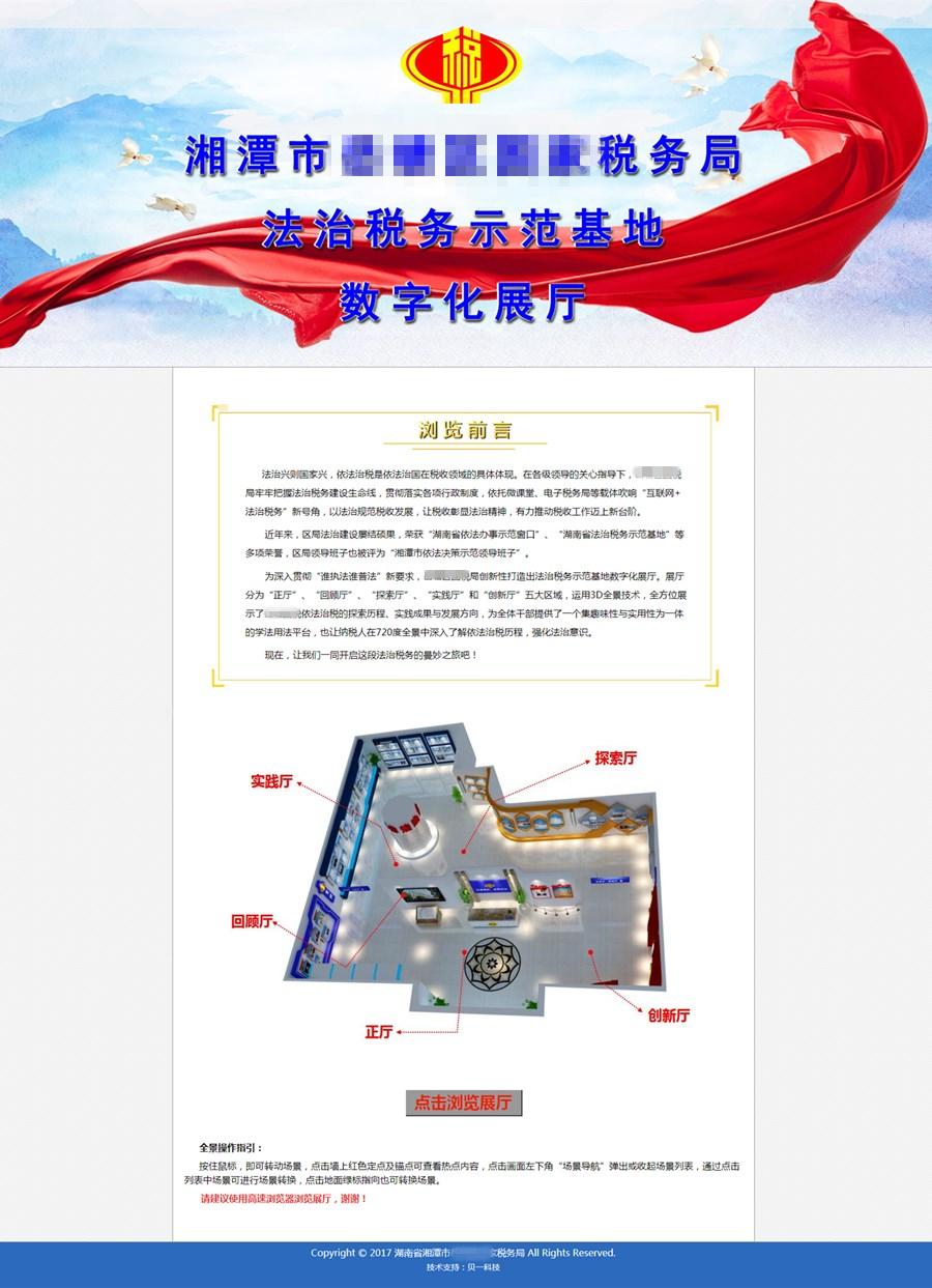 為深入貫徹“誰執(zhí)法誰普法”新要求,XXX國稅局創(chuàng)新性打造出法治稅務(wù)示范基地數(shù)字化展廳。展廳分為“正廳”、“回顧廳”、“探索廳”、“實踐廳”和“創(chuàng)新廳”五大區(qū)域,運用3D全景技術(shù),全方位展示了XXX國稅依法治稅的探索歷程、實踐成果與發(fā)展方向,為全體干部提供了一個集趣味性與實用性為一體的學(xué)法用法平臺,也讓納稅人在720度全景中深入了解依法治稅歷程,強化法治意識。