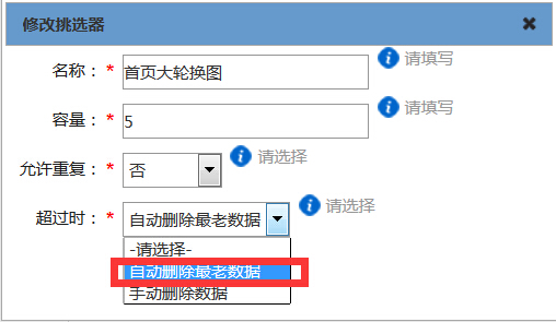 注:修改挑選器容量(即幾圖輪換)和是否允許重復(fù)的文章圖片播放也是此操作步驟,只是修改“容量”后的數(shù)值,或選擇“允許重復(fù)”的是與否。