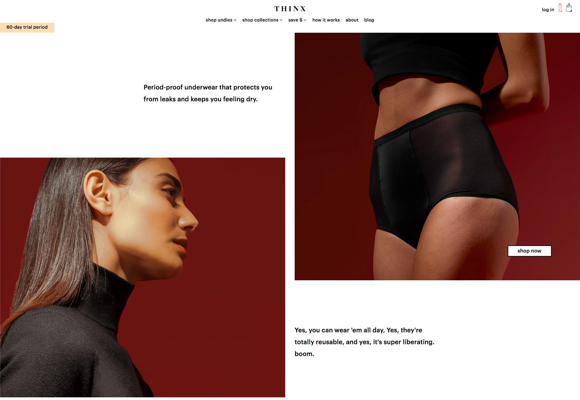 Thinx 這個案例我非常喜歡,并且經(jīng)常會用到,因為它證明了設(shè)計師并不一定非得靠高飽和度的霓虹色來創(chuàng)造高對比度的配色。即使是兩種平衡的顏色,也能讓整個設(shè)計脫穎而出。
