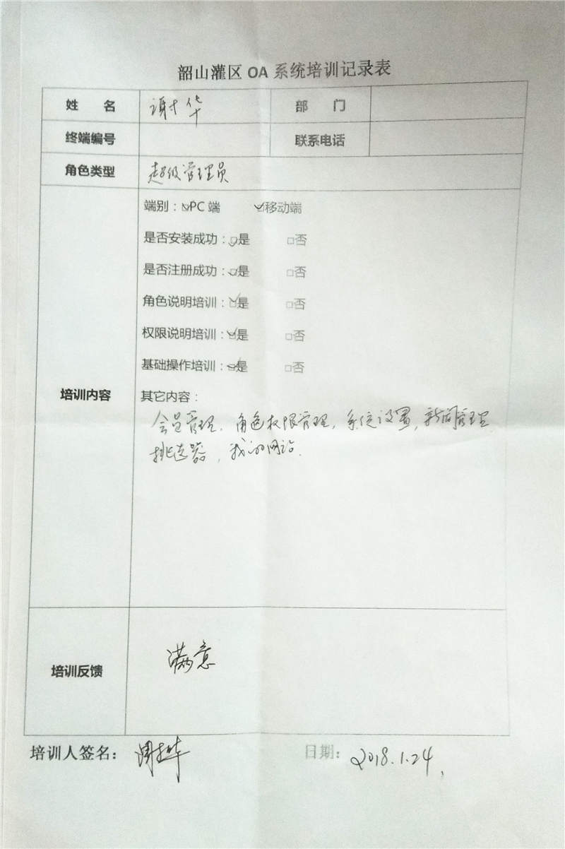 會后,我司該項目負(fù)責(zé)人還針對灌區(qū)超管進(jìn)行一對一培訓(xùn)指導(dǎo),對超管的獨(dú)有功能模塊進(jìn)行仔細(xì)講解,培訓(xùn)人對詳細(xì)的講解的效果表示滿意。并一起討論全員性培訓(xùn)方案。