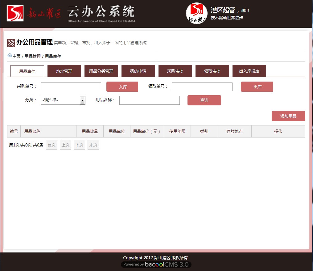 本模塊名為辦公用品管理,用于韶灌辦公區(qū)域的用品管理。特點(diǎn)是操作簡(jiǎn)單方便,能滿足對(duì)用品的各種操作,這是集申領(lǐng)、采購(gòu)、審批、出入庫(kù)于一體的用品管理系統(tǒng)。 |