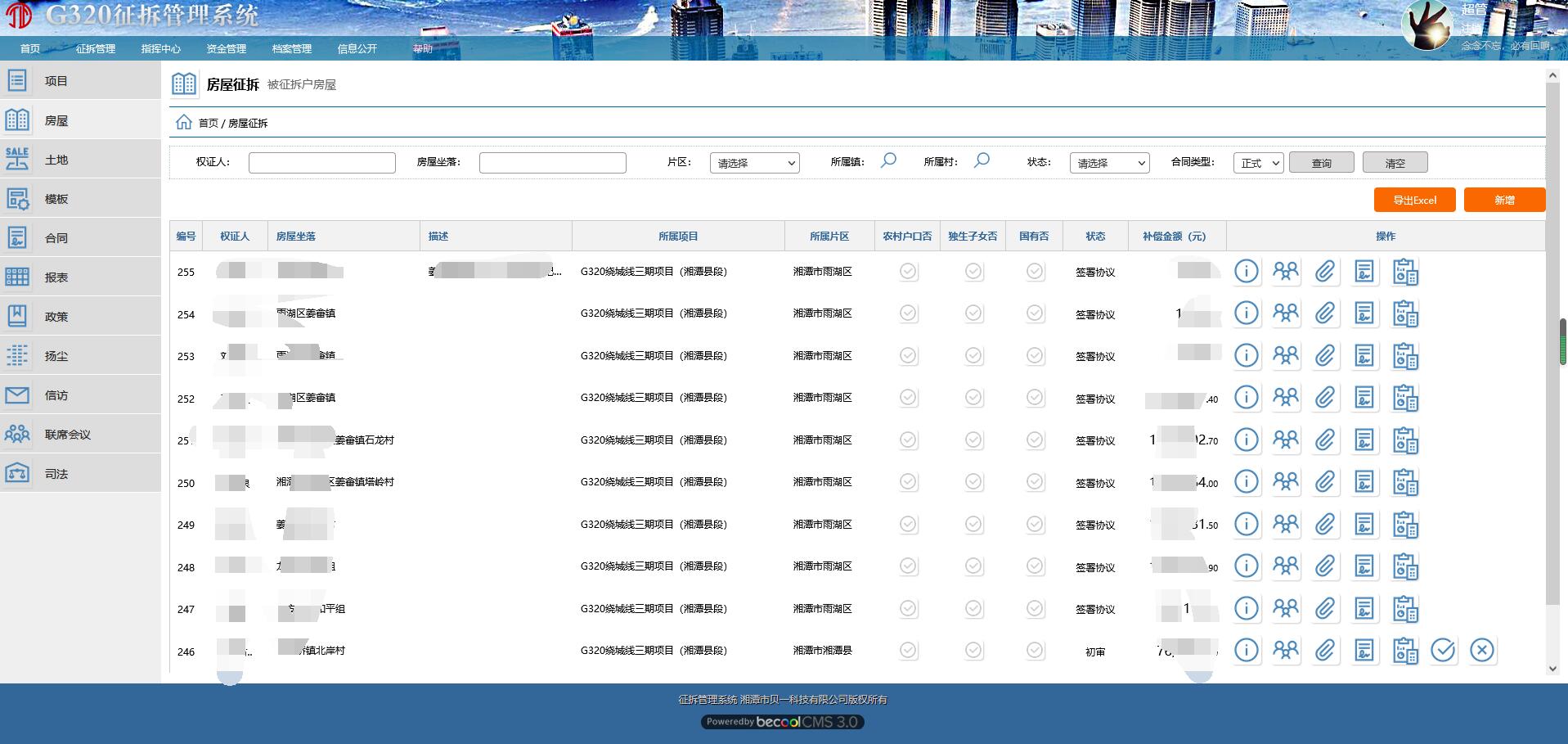 G320 征拆管理系統(tǒng)建設(shè)項目由湘潭中冶建信項目管理有限公司、湘潭市優(yōu)居中心(含下屬各區(qū)縣優(yōu)居中心)、湘潭市交通局、湘潭市貝一科技多方聯(lián)合設(shè)計開發(fā)的平臺級項目。遵照在實際征拆工作中,優(yōu)居中心、建設(shè)方、投資方、監(jiān)管方的工作需要,進行的100%事實業(yè)務(wù)全程數(shù)據(jù)電子化定制開發(fā)。項目可復用于其它市州優(yōu)居中心,包含政策錄入、資金監(jiān)管、進度追蹤、線下數(shù)據(jù)采集、征拆工作一張圖、地理圖像、合同協(xié)議生成、被征拆對象簽約、檔案歸檔及追蹤等等功能模塊,包含移動端和PC端,已應用于實際工作中,且已產(chǎn)生實際效益。
